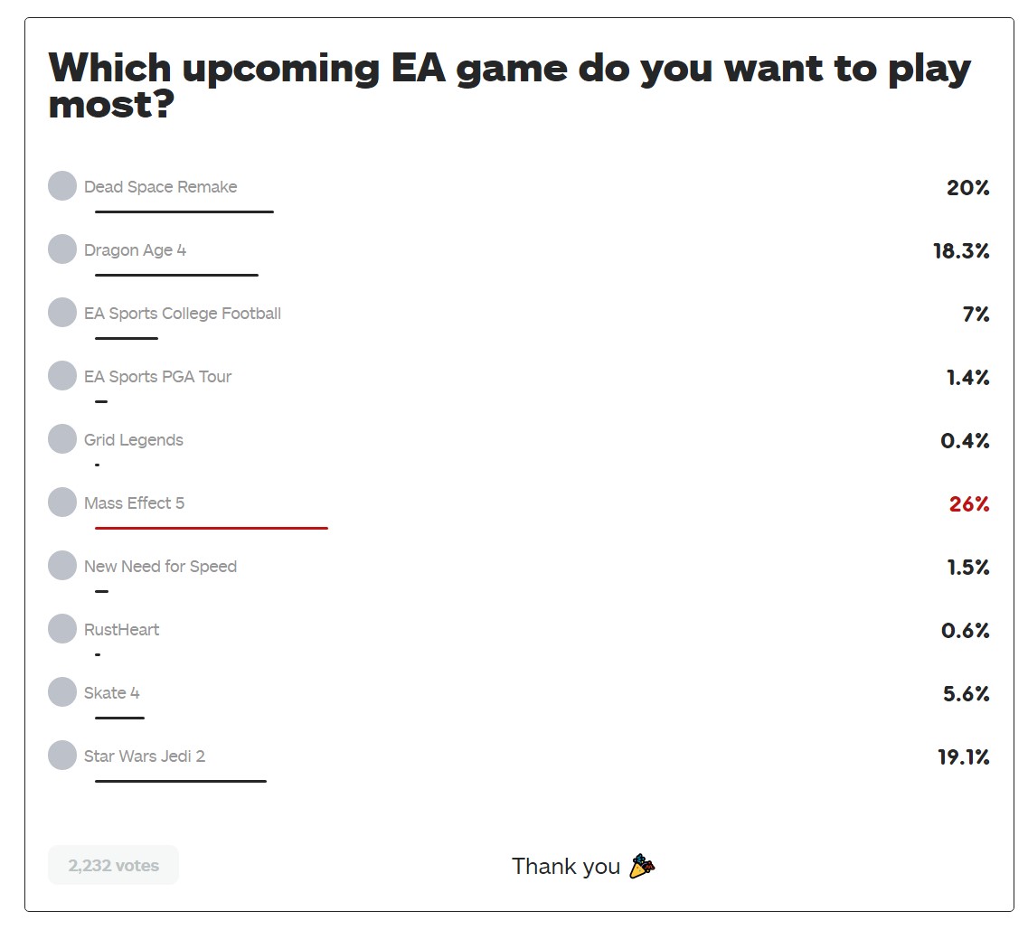 今日(2月8日),IGN发起了一项新投票——EA即将到来的新作你最想玩哪一款?其中《质量效应5》(新作)以26%的得票率夺得第一,《死亡空间:重制版》以20%得票率获得第二,《星球大战绝地:陨落的武士团2》以19.1%得票率夺得第三。 ...