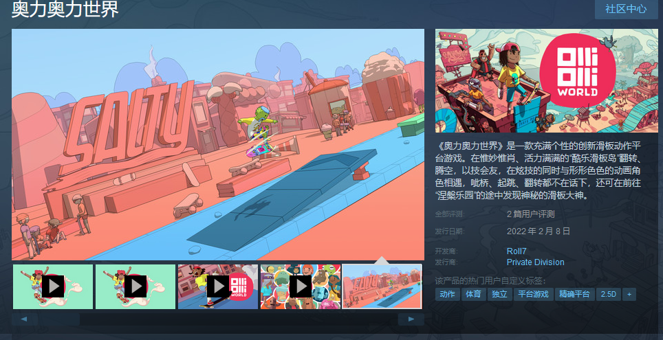 滑板游戏《奥力奥力世界》今日发售,媒体评分84分。