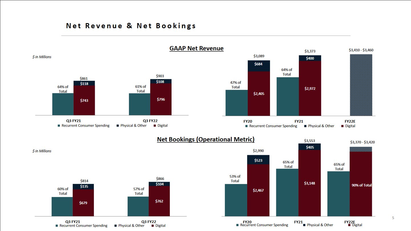 Take Two发布了2022财年第三季度(2021年10月-12月)财报,该季度内Take Two净收入9.03亿美元,比去年同期增长了5%,88%的收入是数字产生,61%的收入来自于玩家的再次消费,这包括DLC、氪金等。净预定值8.66亿美元,增长了6%。营业利润下降到1.54亿美元。 ...