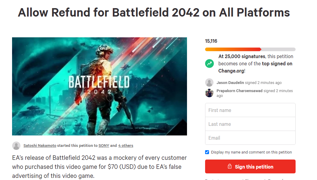 近日一批《战地2042》玩家已在国外请愿网站change.org上发起《战地2042》全平台退款请愿,目前该请愿已得到的签名超过15000人,请愿人表示如果该请愿获得5万人或更多的签名,那么他们将会聘请最好的律师向EA提起诉讼。 ...