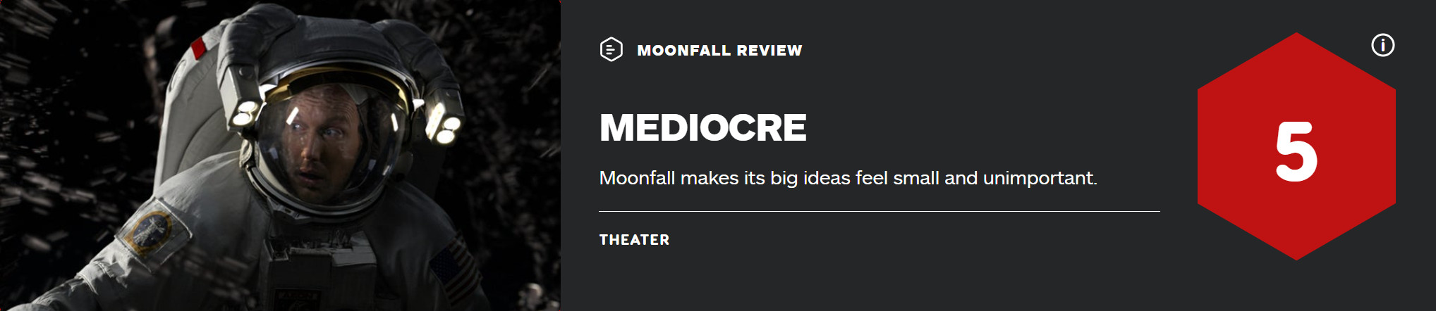 《月球陨落》已在北美上映,影片IGN评分5分,烂番茄新鲜度只有42%,观众评分67%。IGN