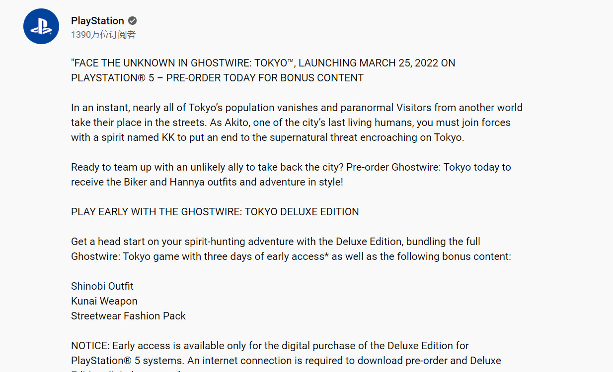 索尼PlayStation YouTube频道发布了《幽灵线:东京》的多个消息,包括发售日,游戏的预购奖励和数字豪华版内容。根据描述,预购《幽灵线:东京》PS5数字豪华版的玩家可以提前3天游玩游戏。 ...