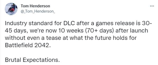 近日,著名游戏记者Tom Henderson发推猜测第一人称射击游戏《战地风云2042》DLC发布的希望渺茫,因为自《战地风云2042》发售至今,EA未公布相关消息,对于一款工业级别的游戏来说,相隔时间过长。 ...